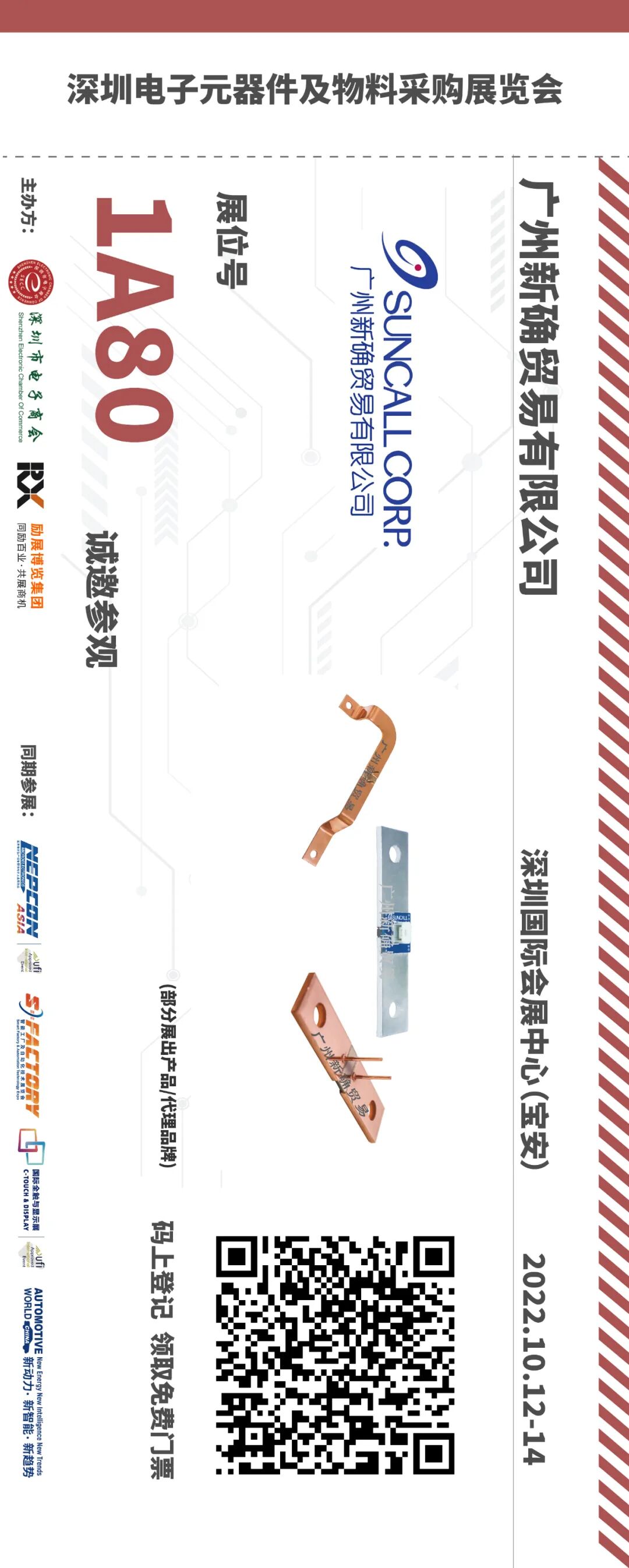 2022 深圳电子元器件及物料采购展览会,将于10月12-14日在深圳国际会展中心(宝安)闪亮登场,隆重开幕。广州新确贸易有限公司期待您的到来,展位号1A80,赶紧收下此邀请函,码上登记,我们不见不散!