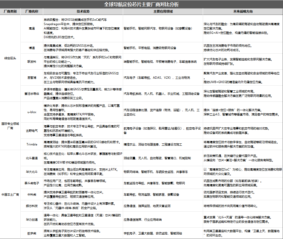 目前,国际大厂依然在全球导航定位芯片市场占据领先地位。其中,高通、博通、联发科、恩智浦、意法等综合龙头公司依旧占据第一梯队,通过集成方案主导着智能手机、汽车导航等市场。u-blox、古野电气(Furuno Electric) 、Trimble等专业领域厂商则在特定市场占有优势。