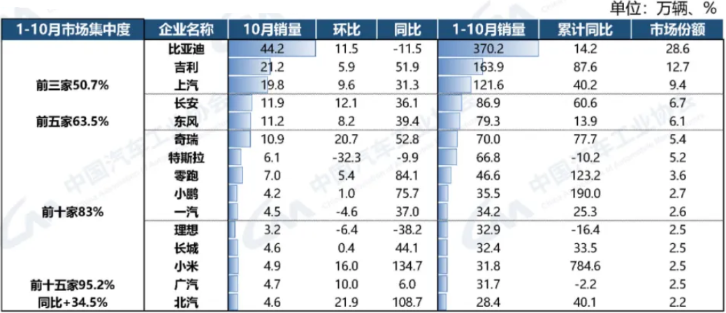 新能源汽车持续领跑市场,10月产销再创新高。当月新能源汽车产销分别完成177.2万辆和171.5万辆,同比分别增长21.1%和20%,新能源汽车新车销量占汽车新车总销量的比例达到51.6%,首次过半,标志着新能源汽车已成为汽车市场的主流力量。1-10月,新能源汽车产销分别完成1301.5万辆和1294.3万辆,同比分别增长33.1%和32.7%,累计销量占比达46.7%,全年高增长趋势明确。