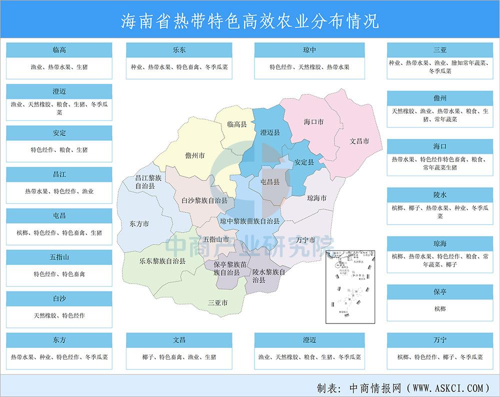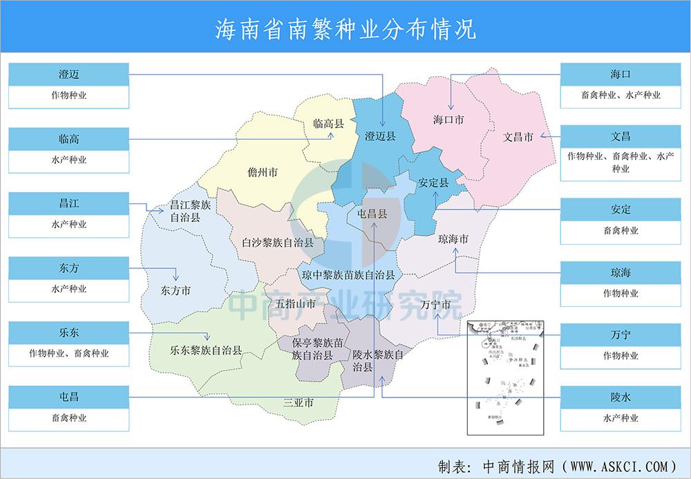 海南以“海澄文定”北部瓜菜基地和“大三亚”南繁育种基地为重点,强化北部都市农业、南部农旅融合功能,梯次推进,进而带动东部滨海现代农业、西部高效热带瓜果农业拓展,促进中部丘陵山地生态农业发展。海南综合考虑各市县区域特点、区域定位、产业基础和未来方向等因素,确定各市县重点产业。