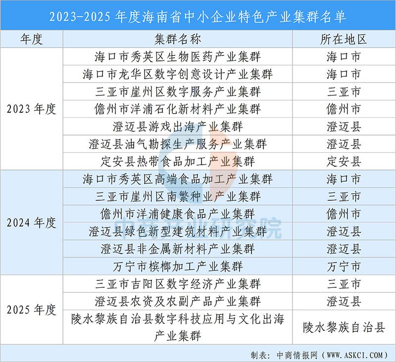 2023-2025年度海南省共有16个产业集群被认定为海南省中小企业特色产业集群,涵盖海口、三亚、澄迈、儋州洋浦、定安、万宁、陵水8个市县,其中澄迈县(5个)、海口市(3个)、三亚市(3个)为核心承载区,占总集群数的68%。