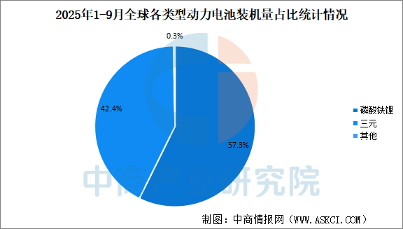 全球动力电池装机量以磷酸铁锂动力电池、三元动力电池为主。2025年1-9月,全球磷酸铁锂动力电池装机量440.4GWh,占比57.3%。三元动力电池装机量325.7GWh,占比42.4%。