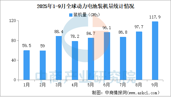 中商情报网讯:2025年9月,全球动力电池装机量约117.9GWh,同比增长43%。2025年1-9月,全球动力电池装机量约768.3GWh,同比增长35%。