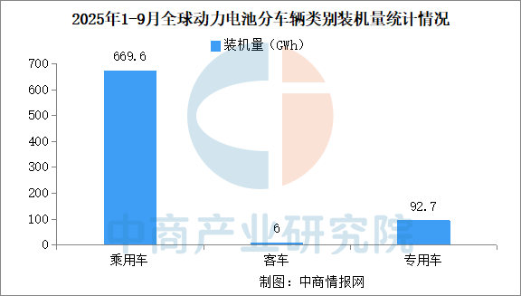 2025年1-9月,全球乘用车动力电池装机量669.6GWh,专用车动力电池装机量92.7GWh。