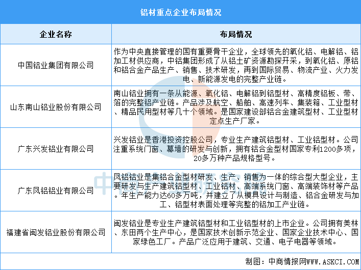 中国铝材企业规模庞大,结构多元。从规模上看,中国铝材行业已经形成了巨大的生产能力和产能,总体产能达到5900多万吨,占据全球铝材行业总产能的较大份额。重点企业包括中国铝业集团有限公司、山东南山铝业股份有限公司、广东兴发铝业有限公司,具体如图所示: