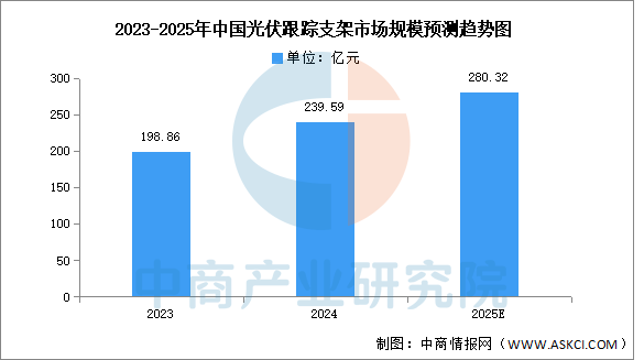 中商产业研究院发布的《2025-2030年中国光伏支架市场调查与行业前景预测专题研究报告》显示,2024年,中国光伏跟踪支架行业市场规模为239.59亿元,同比增长20.48%。中商产业研究院分析师预测,2025年中国光伏跟踪支架市场规模将达280.32亿元。