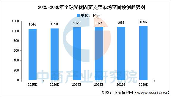 虽然中国光伏支架行业依然以固定支架为主,但光伏固定支架市场逐渐被光伏跟踪支架代替。中商产业研究院发布的《2025-2030年中国光伏支架市场调查与行业前景预测专题研究报告》显示,未来光伏固定支架市场将呈现平稳状态,2025-2030年全球固定支架市场空间为1044亿元、1050亿元、1072亿元、1077亿元、1085亿元、1096亿元。