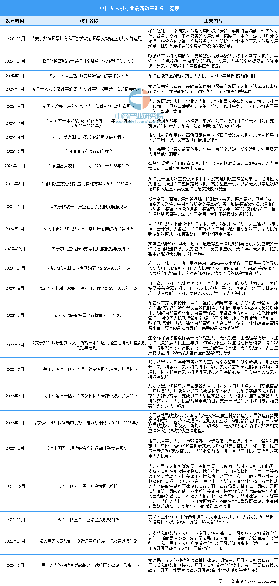 中商情报网讯:我国政府高度重视无人机行业发展,通过一系列政策支持其创新与应用。例如,《无人驾驶航空器飞行管理暂行条例》明确了无人机分类管理规则,规范了设计生产、飞行活动等环节,《通用航空装备创新应用实施方案(2024-2030年)》提出到2030年建立以高端化、智能化、绿色化为特征的通用航空产业发展新模式,推动无人机在物流配送、应急救援等领域广泛应用,《关于深入实施“人工智能+”行动的意见》将无人机列为人工智能与产业融合的重点领域,支持其在农业、物流、应急等场景的应用创新。
