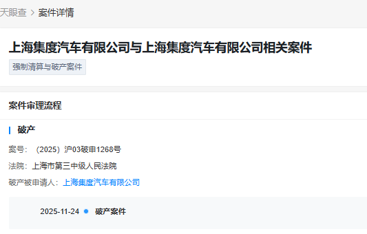 11月24日,天眼查披露,极越汽车关联公司上海集度汽车有限公司新增一则破产审查案件,经办法院为上海市第三中级人民法院。