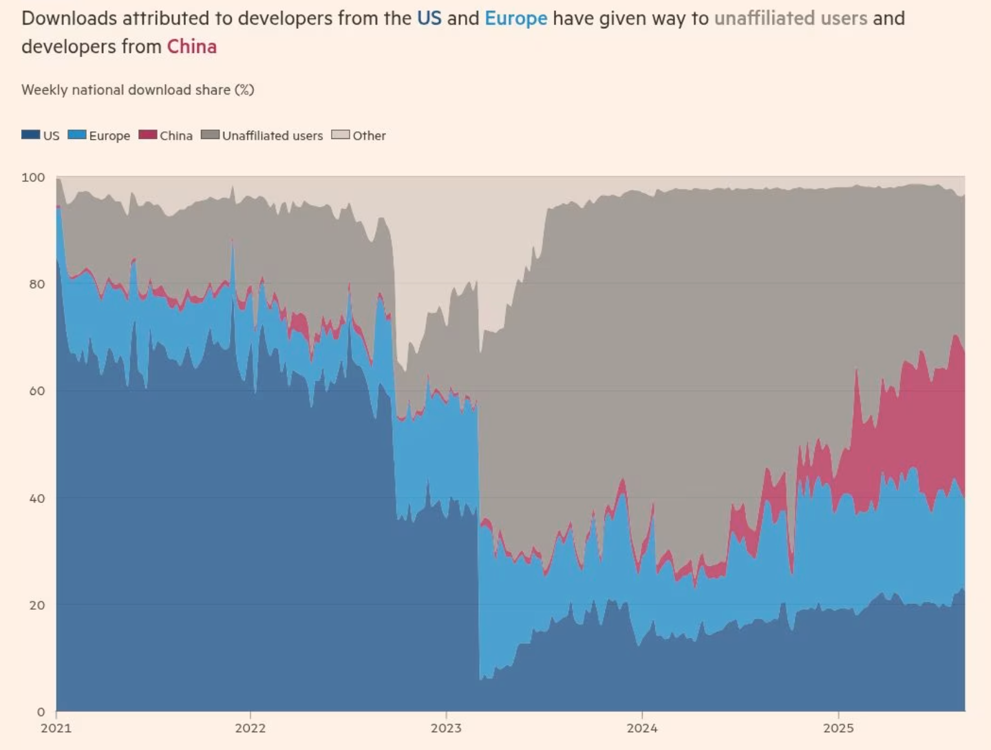 关键词: 中国开放模型 美国 AI模型下载占比 开源模式 模型发布节奏