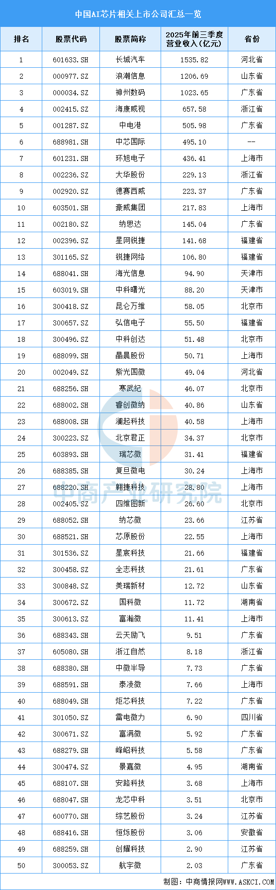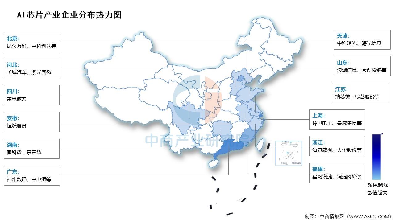 目前,AI芯片相关A股上市企业中,广东省数量最多,共11家。上海市和北京市分别有10家和6家,排名第二第三。