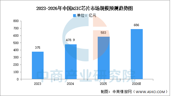 中商产业研究院发布的《2025-2030年中国ASIC芯片(专用集成电路)市场深度分析及发展前景研究预测报告》显示,2024年,中国ASIC芯片行业市场规模为478.9亿元,同比增长27.71%,标志着中国ASIC行业已形成从设计到落地的完整闭环,未来需持续突破,2025年约为583亿元。中商产业研究院分析师预测,2026年中国ASIC芯片市场规模有望超过600亿元。