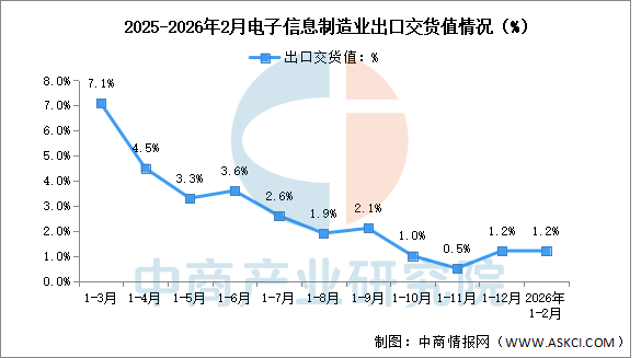 1—2月,规模以上电子信息制造业累计实现出口交货值同比增长1.2%,较2025年全年提高1.2个百分点。