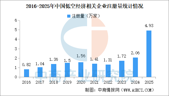 近十年,我国低空经济相关企业注册量基本逐年增加,2025年全年,我国低空经济相关企业注册量同比激增139.1%至4.93万家,创注册量及增速双新高。截至4月1日,2026年我国已注册9193家低空经济相关企业。