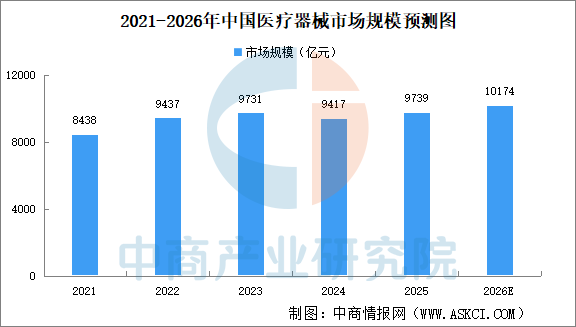 中国医疗器械行业的发展速度快於全球医疗器械行业。中商产业研究院发布的《2026-2031年中国医疗器械行业调查及发展前景研究报告》显示,2025年中国医疗器械市场规模9739亿元,中商产业研究院分析师预测,随着短期波动正常化,市场将迎来复苏。在预防性健康需求、数字化及人工智能应用的推动下,2026年中国医疗器械市场规模将达10174亿元。